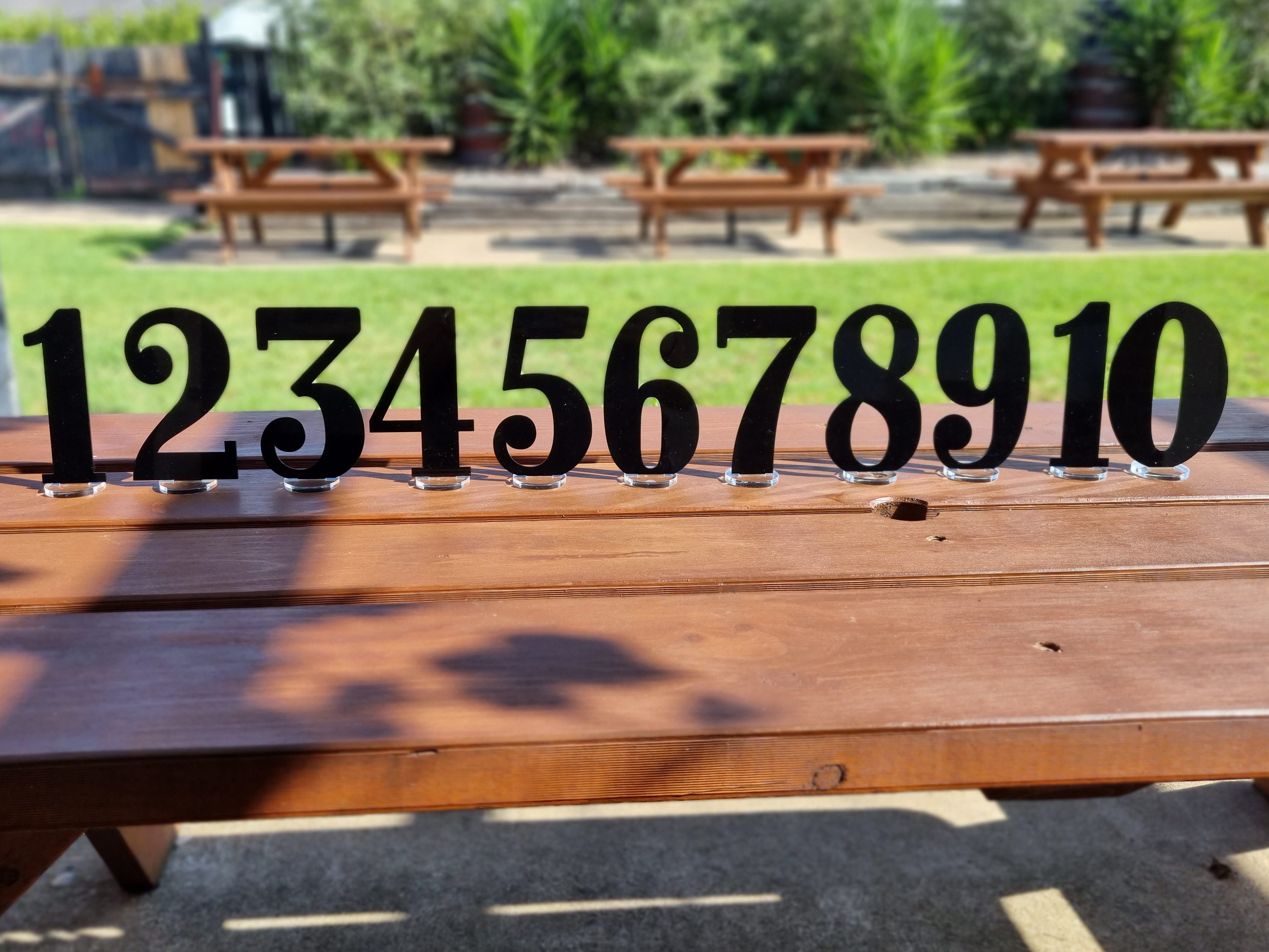 Black acrylic table numbers on a clear stand. Numbers 1 to 10 available.